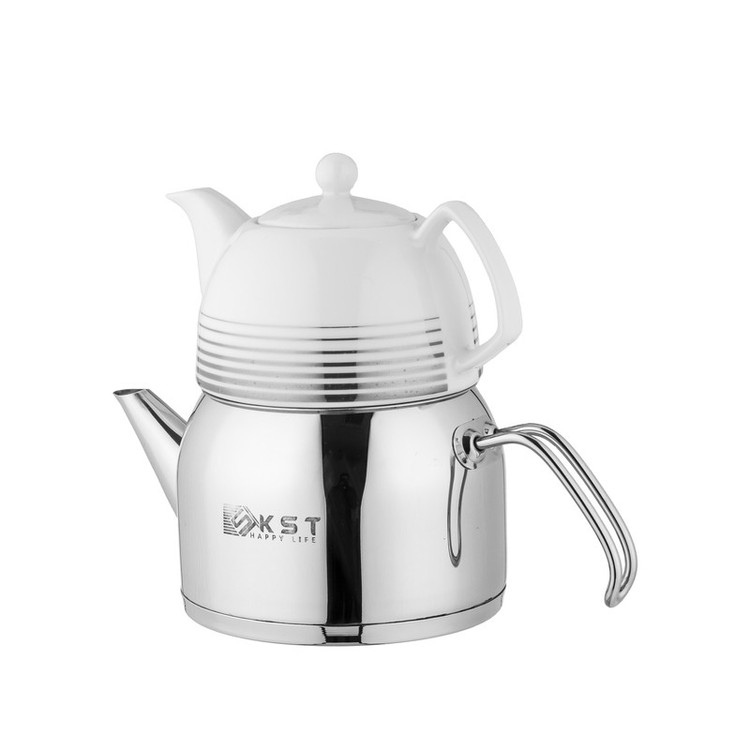ست کتری و قوری لوله ای مدل ترک دسته باکالیت KST از بهترین برندهای کتری و قوری است.کفه ی ضخیم دایکاست که در این کتری به کار رفته باعث میشود حرارت به طور یکنواخت در کل کفه تقسیم شود و از سوختن کتری جلوگیری کند.شیر بلند این امکان را میدهد که بر روی هر اجاقی قابل استفاده شود.درپوش فنری و دسته های استیل از دیگر مزایای آن است. طراحی بسیار زیبا در کنار کیفیت بالا شاخصه ی کتری های کی اس تی است که آن را باب میل سخت پسندان میکند. قوری به صورت متفاوت قرار می گیرد دارای جوش برنجی در بخش لوله هستن هستن که این جوش به رنگ طلایی است ایراد ساختاری محصوب نمیشود.