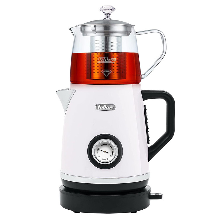 فلر آلمان یکی از شرکت های معروف و موفق در ساخت لوازم خانگی است. یکی از محصولات این برند، چای ساز مدل TS190 است که دارای 1600 وات قدرت برای گرم شدن سریع چایساز می باشد. بدنه این محصول به صورت مینیمال و از جنس استیل ضد زنگ بسیار با کیفیت است. کف کتری دارای یک المنت است که با یک پوشش فلزی پوشانیده شده است. حجم یا ظرفیت کتری چای ساز 1.2 لیتر است که شما می توانید برای خانواده کم جمعیت ، چای درست کنید. این چای ساز دارای یک قوری شیشه ای 0.7 لیتری است که درون آن یک تفاله گیر استیل ضد زنگ وجود دارد. پایه چای ساز دارای محفظه جمع آوری سیم برای قرارگرفتن راحت در آشپزخانه می باشد. چای ساز TS 190 فلر قابلیت چرخش 360 درجه برای بلند کردن آسان کتری را دارد.