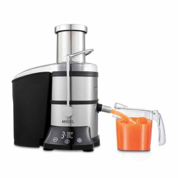 آبمیوهگیری «میگل» (Migel) مدل «GPJ 800» دستگاهی کارآمد برای آبگیری سریع و آسان میوههای مختلف است. این آبمیوهگیری با بدنهای از جنس استیل ضدزنگ دارد که البته بهخوبی طراحی شده و کیفیت نهایی مطلوبی دارد. با استفاده از صفحهنمایش میتوانید تنظیمات مدنظرتان مانند سرعت را اعمال کنید. این مدل قابلیت تنظیم بر روی 4 سطح سرعت را دارد. سرعت کم برای آبگیری میوههای نرم مانند هندوانه، انگور، گوجه فرنگی و خیار و سرعتهای زیادتر برای آبگیری میوههای سفت مانند سیب، هویج و چغندر مناسب است. دهانه ورودی آبمیوهگیری بزرگ است و به قطر 85 میلیمتر طراحی شده که امکان ورود میوههای درسته مثل یک سیب کامل را بدون نیاز به خردکردن آن فراهم کرده است. این آبمیوهگیری میگل مجهز به ظرف تفاله بزرگ با ظرفیت 2 لیتر است که امکان آبگیری پیوسته و بدون وقفه میوه را به شما میدهد. فیلتر و تیغهی GPJ 800 از جنس استیل ضدزنگ تهیه شدهاند و به همین دلیل ارزش خرید بالایی را برای این دستگاه به همراه دارند.