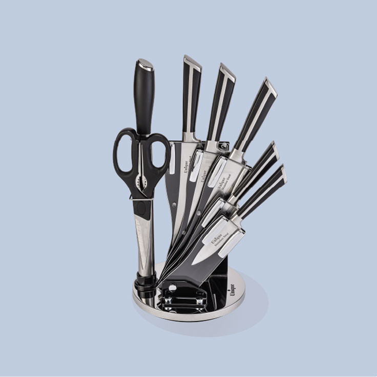 رویس چاقو معمولا شامل چندین نوع چاقو با اندازه و اشکال مختلف است که برای استفاده در آشپزخانه مناسب هستند .این سرویس معمولا شامل چاقو های مختلف برش ، سایش دهنده و...میباشند.هرکدام از این چاقو ها برای کارهای خاصی انجام می شوند مانند ،برش میوه و سبزیجات ، برش گوشت یا نان ،برش چیزهای نرم و غیره مناسب هستند .طراحی شکیل و منحصر به فرد این نوع چاقو ها علاوه بر کارایی ،زیبایی خاصی به آشپزخانه شما می بخشد. سرویس کارد یونیک یکی از برند های معروف و با کیفیت در زمینه تولید ابزار های برش آشپزخانه است.این برند معمولا از جنس استیل ضد زنگ ، با کیفیت بالا برای ساخت محصولاتش استفاده می کند .کاردهای مارک یونیک از نوع کارد های دارای لبه تیز و مقاوم هستند که برای برش مواد غذایی مختلف یه کار می روند .همچنین طراحی زیبا و ارگونومیک این محصولات ، آشپزها و علاقمندان به آشپزی را جذب خود می کند.با توجه به کیفیت و عملکرد بالای آنها ،کارد ها و چاقو های مارک یونیک گزینه ی عالی برای استفاده در آشپزخانه می باشند.