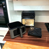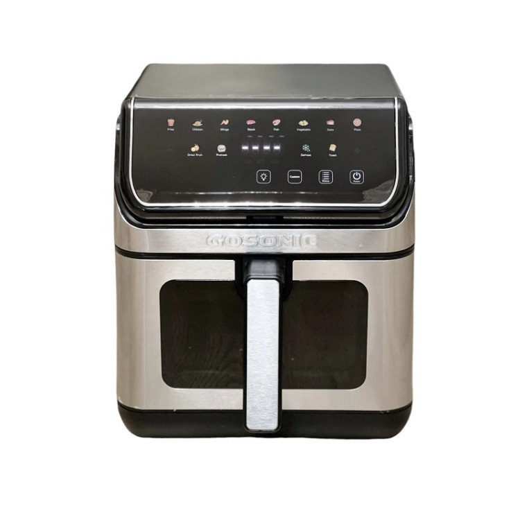 متاسفانه این کالا در حال حاضر موجود نیست. میتوانید از طریق لیست بالای صفحه، از محصولات مشابه این کالا دیدن نمایید.سرخ کن بدون روغن گوسوینک مدل 958 به رنگ مشکل سیلور می باشد که جنس بدنه دستگاه از نوع استیل ضد زنگ به همراه پلاستیک مقاوم میباشد. این دستگاه دارای توان مصرفی قدرتمند 2000 وات به همراه دو المنت می باشد که المنت بالا دارای توان 1500 وات و المنت پایین توان 500 وات را دارا است. بسکت و صفحه داخلی دستگاه از نوع آلومینیوم با روکش سرامیک می باشد که در دوطبقه مجزا و بصورت همزمان امکان پخت و پز را فراهم می کند. ظرفیت دستگاه 8 لیتر می باشد و صفحه نمایش آن از نوع دیجیتالی رنگی بوده که 12 برنامه متنوع پخت و پز را دارا است قطع کن خودکار و تایمر قابل تنظیم تا 60 دقیقه از سایر مشخصات این دستگاه می باشد این دستگاه زیبا جزو قوی ترین و جدیدترین سری سرخ کن های بدون روغن برند محبوب گوسونیک محسوب میشود.