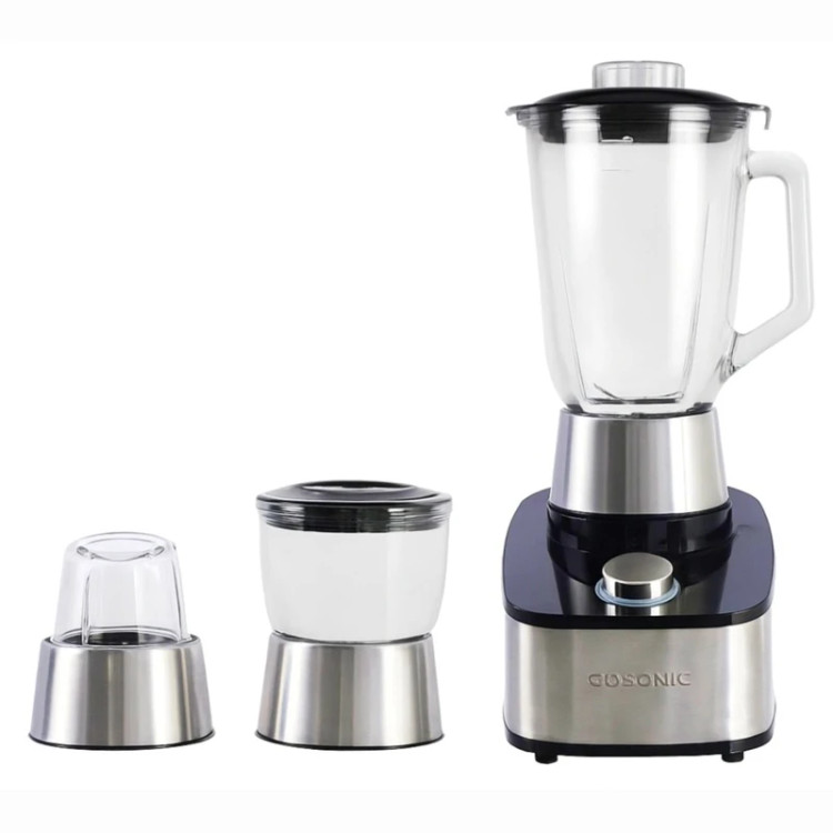 مخلوط کن سه کاره گوسونیک قابلیت آسیاب، مخلوط کن و خردکن را دارد موتور 600 واتی،ساخته شده از سیم پیچ مسی ، با 4 حالت قابل تنظیم دور موتور متغیر و دارای حالت پالس( لحظه ای) می باشد ، دارای پارچ با گنجایش ۱.۵ لیتر و ظرف خردکن نیم لیتر می باشد